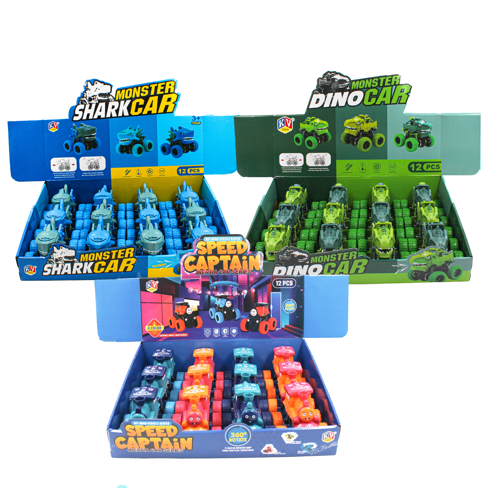 12 Pcs Friction Power Monster Shark, Dino & Speed Train Car With 360 Rotation